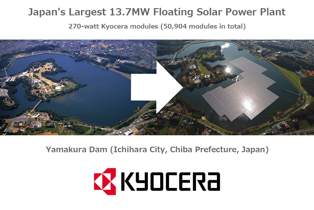 https://www.youtube.com/watch?v=NDnVBFqpFpI The largest floating PV power plant in Japan: 13,744 kWp Installed on a water retention reservoir, Yamakura Dam, in Chiba prefecture. Project developed by Kyocera TCL Solar LLC Hydrelio® floating system provided by Ciel & Terre® International company.