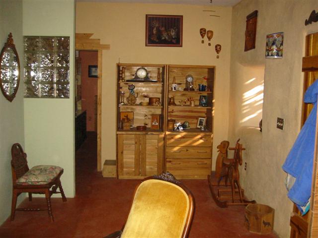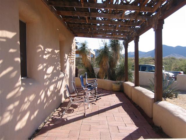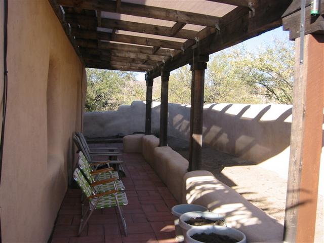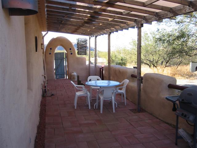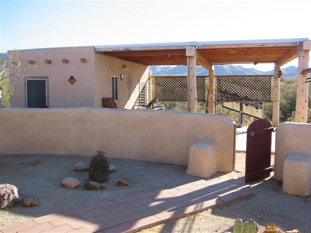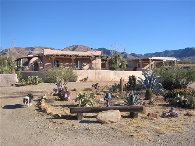 Side of house that faces the driveway. Pictured is “Henry” who was left behind and loves to hang there. He was too scared to be captured by the old owners, so they had to leave him behind. He can’t be touched but does follow us around as we walk the property. He eats our food and by barking at the coyotes keeps them away. He gets along with our two dogs and instead of sleeping in the dog house that was left behind he sleeps on the hay in front of it.Kitchen and dining area. Generally, an off-grid building must be able to supply energy and potable water for itself, as well as manage food, waste and wastewater.Living Room with wood stove. This little stove is all the heat that is needed for an Arizona winter. It takes the chill out of the air, and with the strawbale construction the heat is retained nicely.Front door on right, hallway toward bedrooms on left.BathroomHallway from bath. Portia on her favorite windowsill. The windowsills are two feet deep. Main bedroom-the hang out for Sundance and Cheyanne. Approx. 13×13.The second bedroom is our computer room. Approx. 11×13.Two tanks that collect the water from the roof of the house and carport.Solar panel that supplies the electricity for the house. Batteries store power for night time and cloudy days. The solar panel tracks (moves) with the sun.