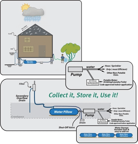 Why rainwater pillow tanks to collect rainwater – Pillow tanks are flexible storage tank options that can be installed in crawlspaces and under decks to hide them from view. Pillow tanks are often used with inlets that can be connected to downspouts. This allows them to collect water directly from a downspout or gutter system. In general, filling of a rainwater harvesting pillow tank can include gravity flows, pumps, or other options.